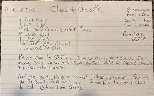 A turducken is a chicken in a duck in a turkey, and stuffing might also be included. What in the world? Ok, I had to go even if it meant washing all the dishes. I went and it was … interesting. It tasted fine and I am ok with all three fowl, but it just seemed busy and dry to me (and to no ones surprise there were a ton of dishes) I enjoyed the chocolate chess pie more I have to say. So, I will leave you with that recipe:
