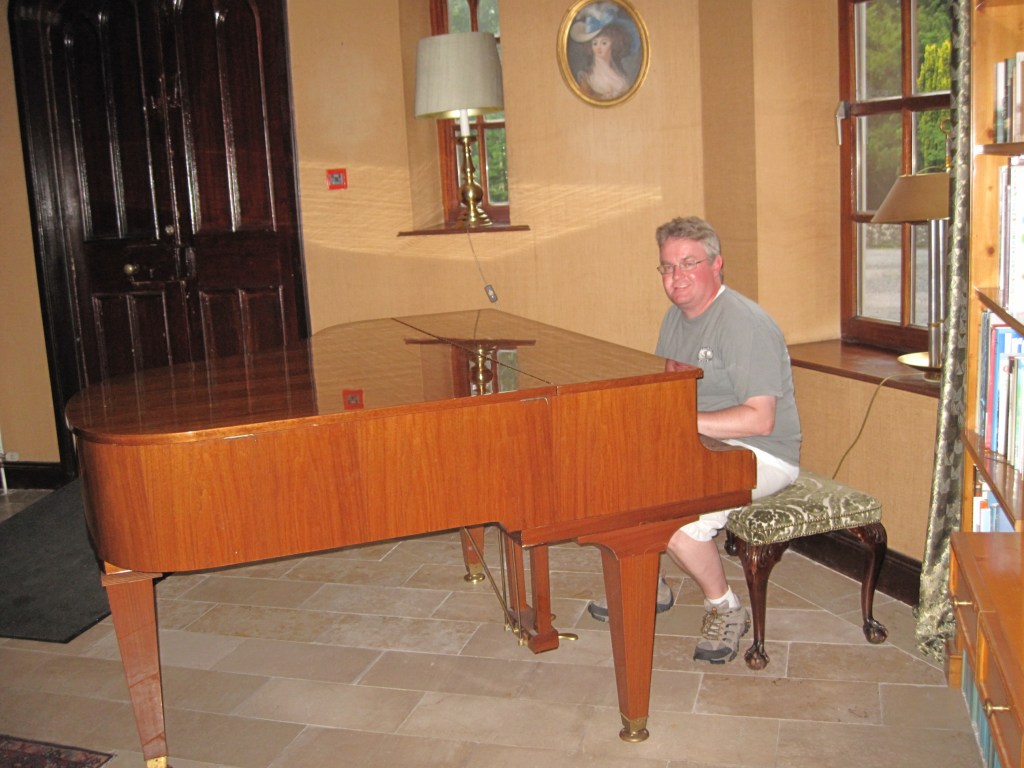 And a cool study with a grand piano and books.
