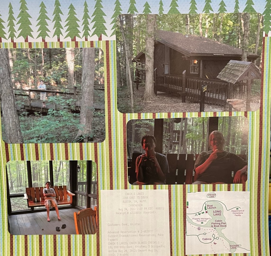 For many years, we would rent a cabin at Chain O’Lakes State Park just northwest of our house. Cabins in the summer can only be rented for the week, which was probably the right amount of time for Matt and Alex and about 5 days too long for me. I had never been a camping person. I like the outdoors. I like taking walks in the woods and feeling the sun on my face. But I just have never figured out the adoration for camping. Maybe it was growing up in a house where the nature kept making its way inside. Maybe it was my allergies to everything from cut grass, tree pollen and warm-blooded animals. Maybe it was the emotional scars from Girl Scout camp and the daddy long legs on the faded yellow/gold tent canvas. Not sure, just know that my mother was greatly disappointed that I did not inherit her love of camping.