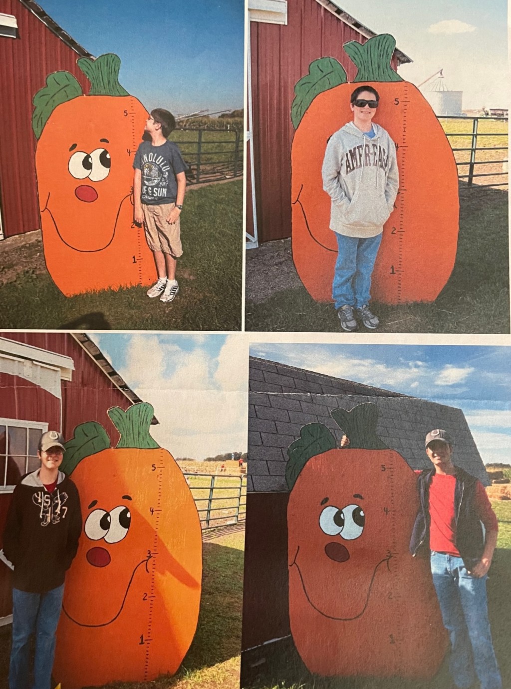 Each year the farm makes a new maze and there are stops in the maze to get a stamp or punch to enter to win something (we have never won, it really wasn’t about that). They have hay mounds to climb and cut out wooden figures to pose behind or next to (we are big fans of that) It was honestly just happenstance we took Alex’s picture by the big pumpkin cut out with height measurements.